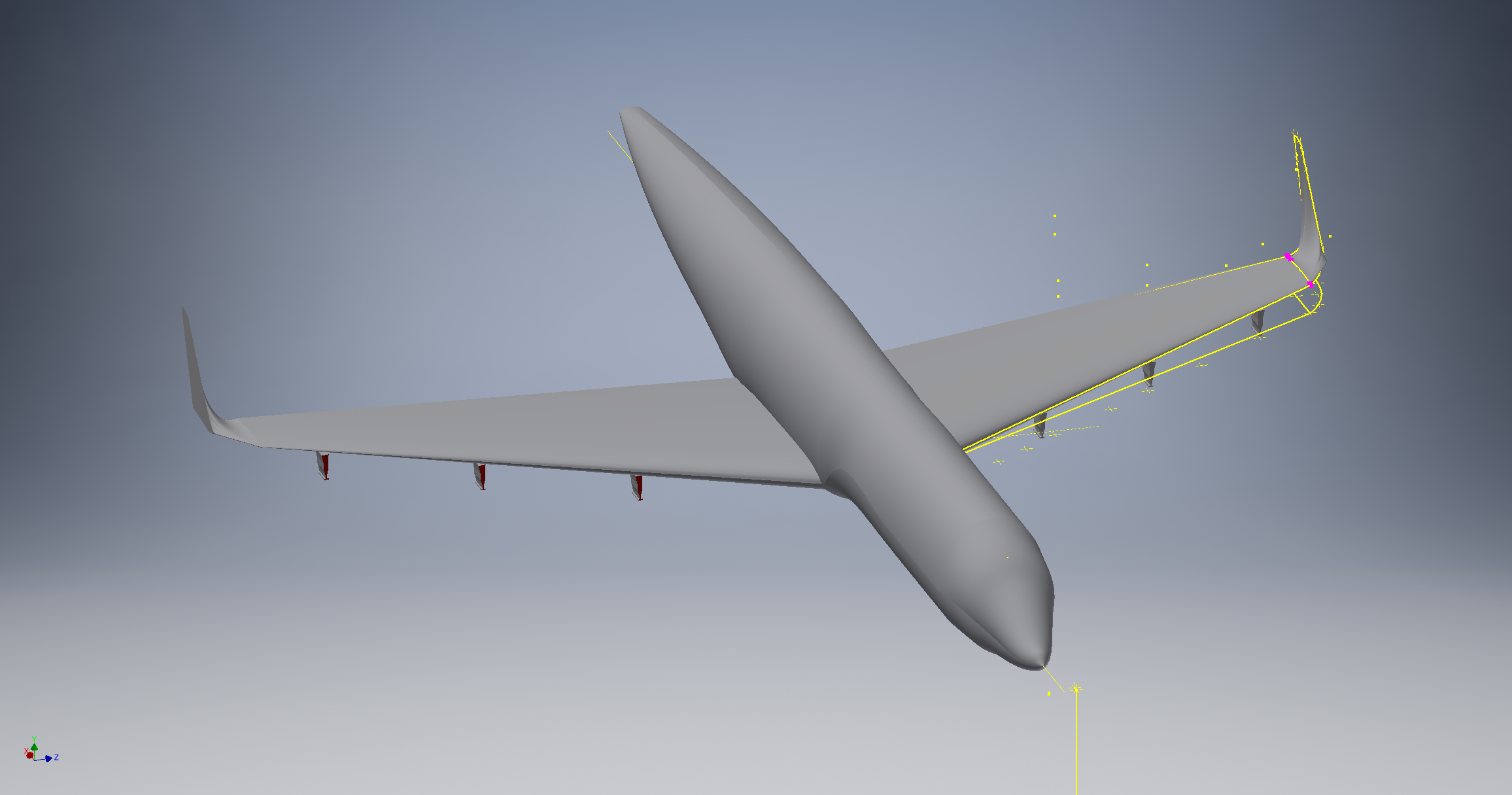 The tail is created by taking the points from the top view. The points are extended and then cut from the side view. The wings are lofted from the vertical stabilizer using the NACA 64A008.5 airfoil for the root and tip.